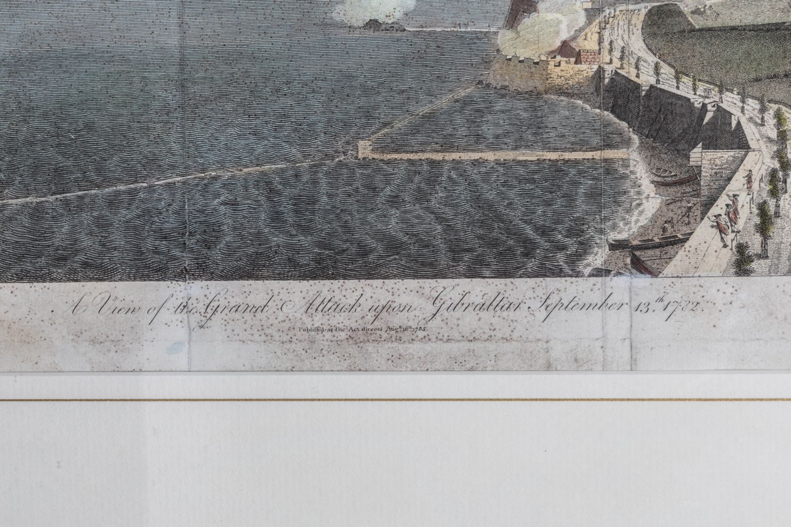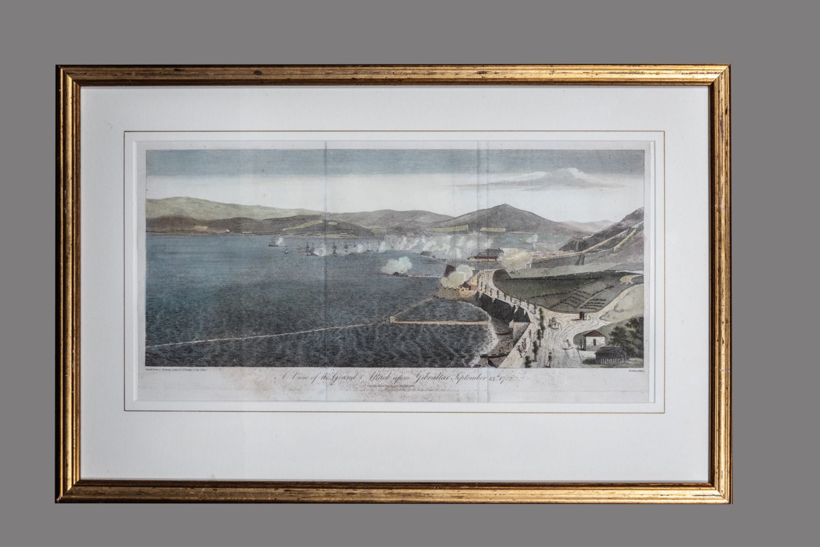 El grabado representa un momento crucial del Gran Sitio de Gibraltar, cuando España y Francia intentaron recuperar el peñón de manos británicas. La escena muestra las fortificaciones españolas disparando desde la costa y la defensa británica desde Gibraltar.
